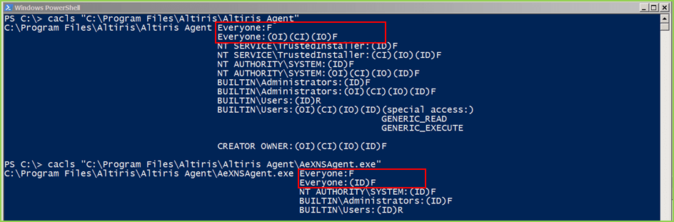 The following screenshots show the permissions applied to the ‘Altiris Agent’ folder and the AeNXSAgent.exe service binary, before modifying the mount point to overwrite the permissions: